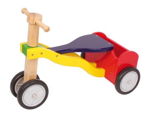 Das stabile Holzrad mit kleinem Gepäckfach im Heck ist bunt und klar lackiert! Die Gummiringe auf den belastbaren Kunststoffrädern sorgen für leise Laufgeräusche und 2 Vorderräder geben Fahranfängern die nötige Stabilität